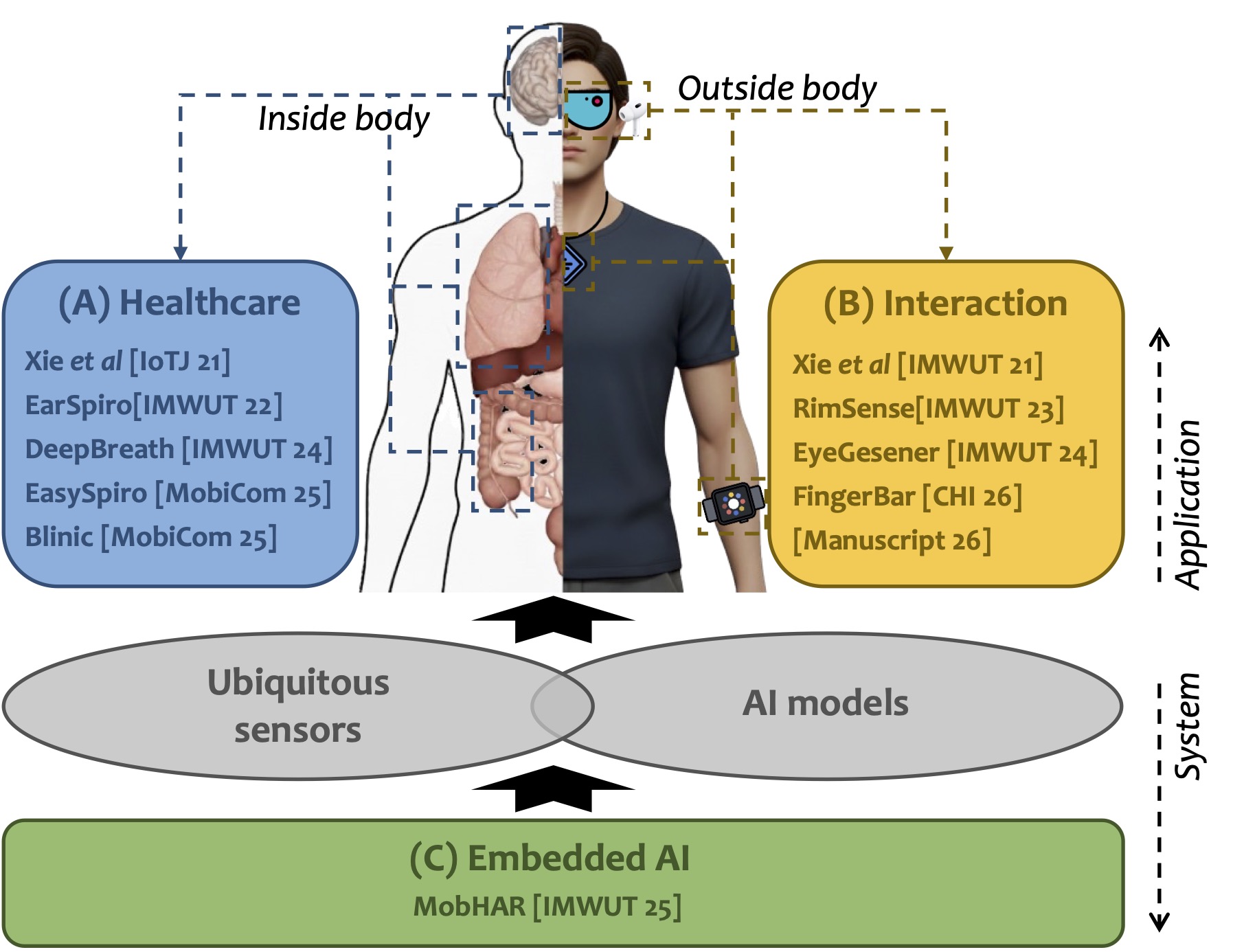 My research solves human-centric problems using ubiquitous sensors and Artificial Intelligence of Things (AIoT) systems. Understanding human behaviour is crucial in domains such as healthcare, wellbeing, and interactive entertainment, yet current approaches often depend on bulky, bespoke hardware that limits their accessibility and real-world impact. In response, my research designs ubiquitous sensing systems and robust AI algorithms to ease the measurement and interpretation human activities, enabling critical applications such as home-based healthcare and interaction with wearable devices. My research is highly interdisciplinary, where I work closely with domain experts such as health professionals to identify real world problems, and use ubiquitous sensing methods to solve them practically. My work has been published in top peer-reviewed journals and conferences such as ACM MobiCom, CHI, and UbiComp/IMWUT.
